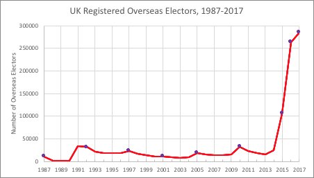 Although there are potentially large numbers of people potentially affected by the Bill, we are in reality unlikely to see that many new registrations: historically, registration levels of overseas electors are low, though they have been increasing since the introduction of on-line registration in 2015 and the EU Referendum in 2016, as shown in the table below. - The Government anticipates that numbers could rise to anything between about 200,00 – 870,000 under the new legislation. But these are very much ‘guesstimates’ since it has no established channels of communication with its expatriate citizens.